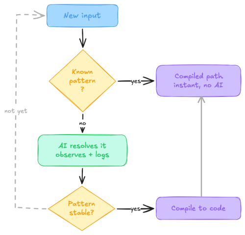 When the observation loop detects that the same pattern has been resolved by AI multiple times… zero remaining ambiguity… it promotes that pattern from “AI-mediated” to “compiled.” A deterministic code path gets generated (a parser, a mapper, a rule). Subsequently, that specific case runs without any AI inference at all. The system upgraded its own capabilities. Nobody specced it. Nobody designed it. Nobody coded it. It grew.