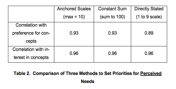 - An anchored scale, where customers assigned weights to each need on a scale from 1-10, where the most important need got 10 points. They performed this task at both the primary and secondary levels, using 7 needs at each level.