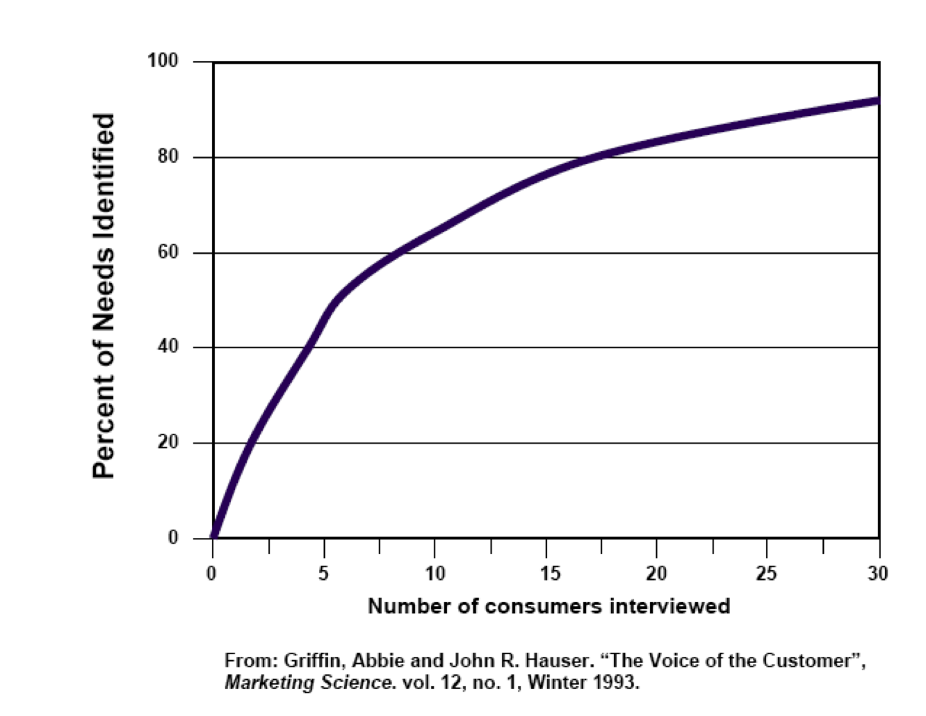 Once again the VOC paper describes an experiment whereby 30 interviews were conducted by 7 analysts, and uncovered 220 needs. In looking at the results, they plotted the number of customer interviews vs. the % of unique needs identified in each session, and arrived at the following plot.