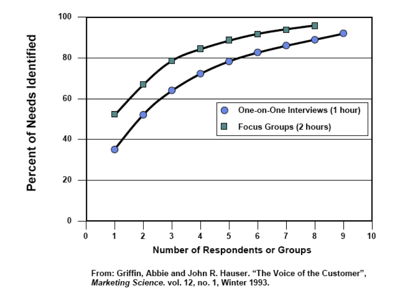 After analyzing that data, they plotted the number of respondents vs. the % of needs identified, with each curve representing each technique (focus group vs. one on one interview). Here's what they came up with:
